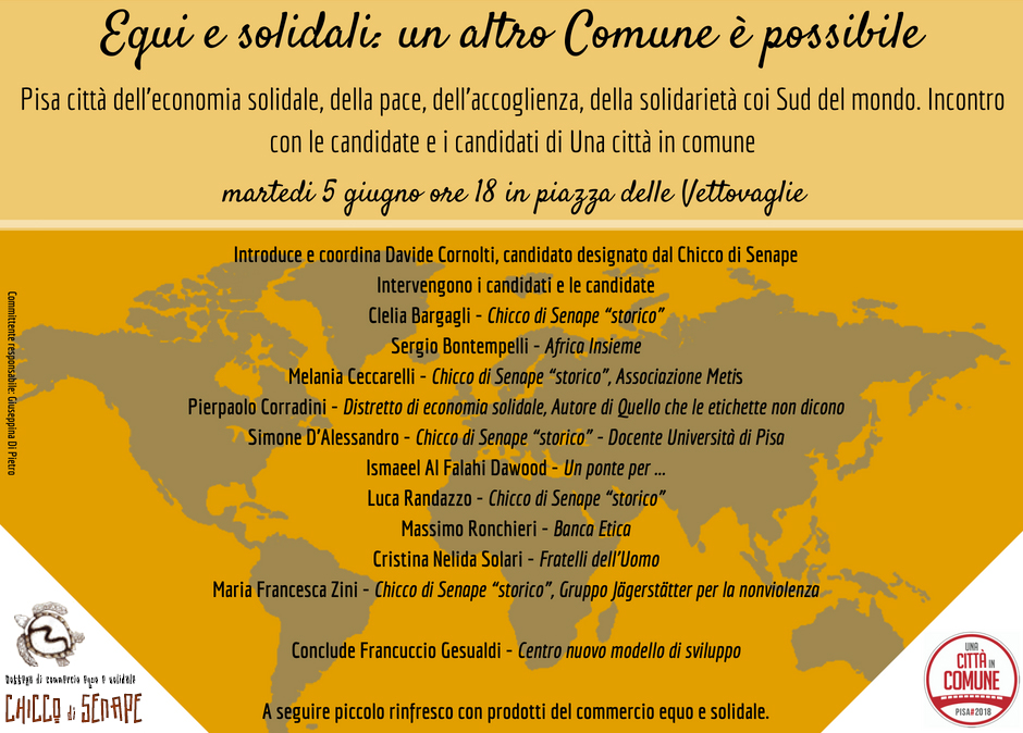 Da un quarto di secolo, dal 1992, il Chicco di Senape è non solo una bottega del commercio equo e solidale ma è uno dei principali punti di diffusione in città e in Toscana delle culture dell’economia solidale, della pace, dell’accoglienza e della solidarietà tra Nord e Sud del mondo. Il suo sostegno a Una città in comune è basato sulla condivisione di principi e obiettivi, ma anche di esperienze di vita e di percorsi biografici. Martedì 5 giugno, alle ore 18:00, davanti alla bottega, in Piazza delle Vettovaglie, i candidati e le candidate di Una città in comune che fanno o hanno fatto parte del Chicco di Senape o che sono impegnate/i nell’economia solidale, nell’associazionismo pacifista, nell’accoglienza e nella solidarietà Nord-Sud (Davide Cornolti, Clelia Bargagli, Sergio Bontempelli, Melania Ceccarelli, Pierpaolo Corradini, Simone D’Alessandro, Ismaeel Dawood, Luca Randazzo, Cristina Solari, Maria Francesca Zini) interverranno all’iniziativa “Equi e solidali: un altro Comune è possibile. Pisa città dell’economia solidale, della pace, dell’accoglienza, della solidarietà coi Sud del mondo. Incontro con le candidate e i candidati di Una città in comune“. Concluderà Francuccio Gesualdi del Centro nuovo modello di sviluppo e la bottega offrirà un piccolo rinfresco con prodotti del commercio equo e solidale.